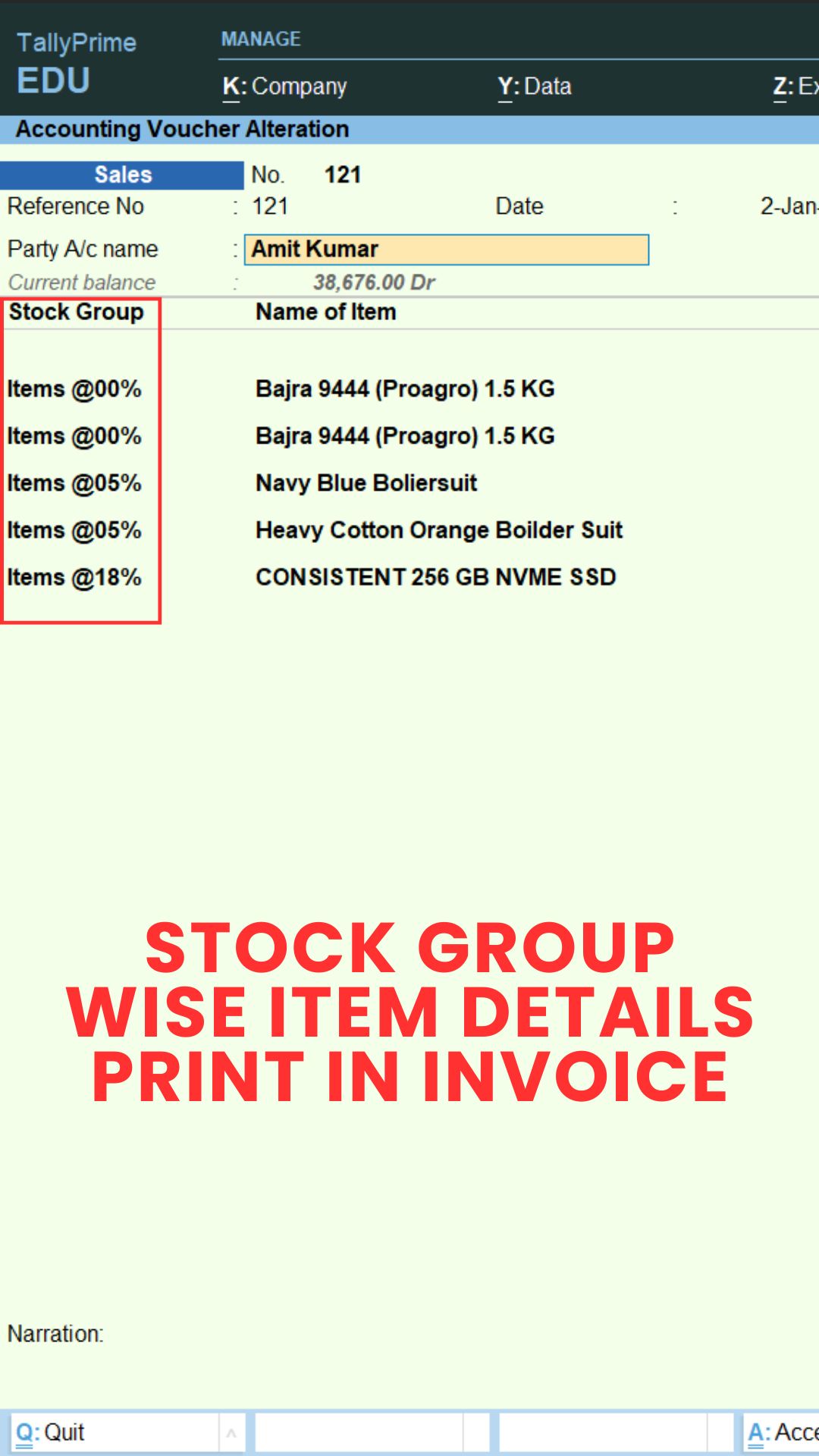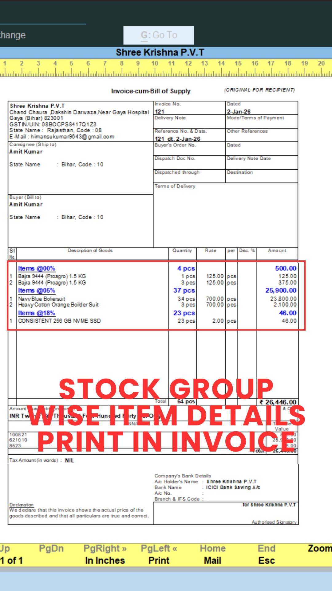 Stock Group wise Item Details Print in Invoice